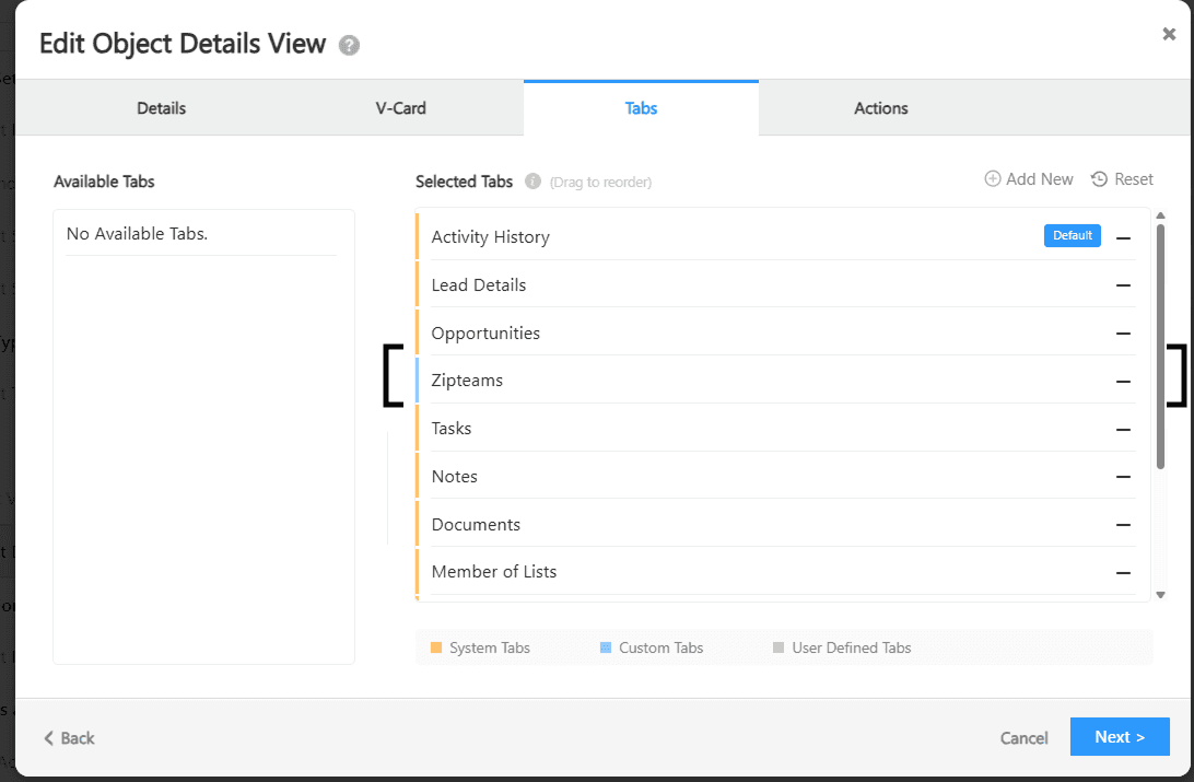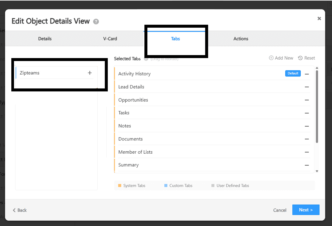 Click on Tabs. Then drag and drop the Zipteams Tab view on the right side according to your preference. Click on next and then click save.